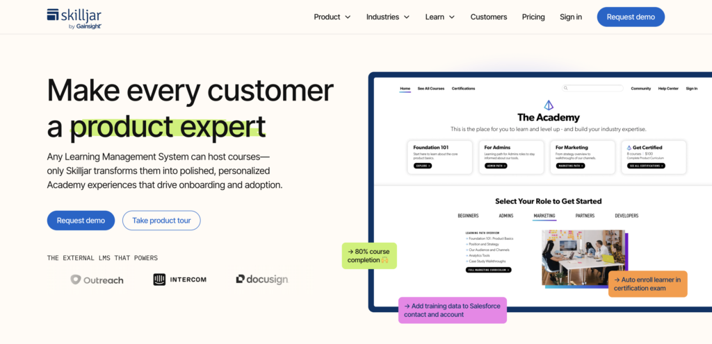 - Integrations: If you can name it, there’s probably a Skilljar integration. It even works with some other tools on this list, like inSided and Totango.