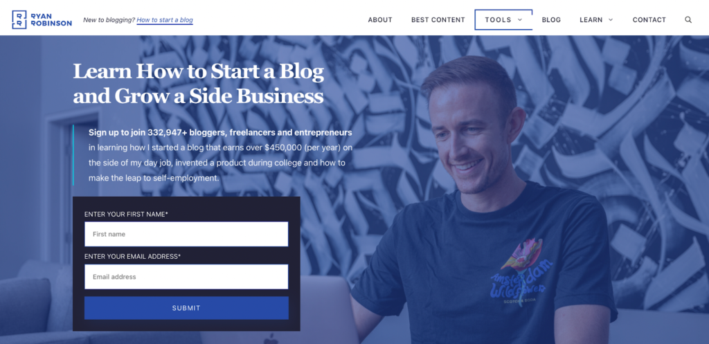To show how valuable a private community is, a form asking people to join his community of over 330,000 entrepreneurs stays front-and-center on Ryan Robinson’s website. In this community, people will learn about blogging, business, freelancing, and podcasting, to mention a few.