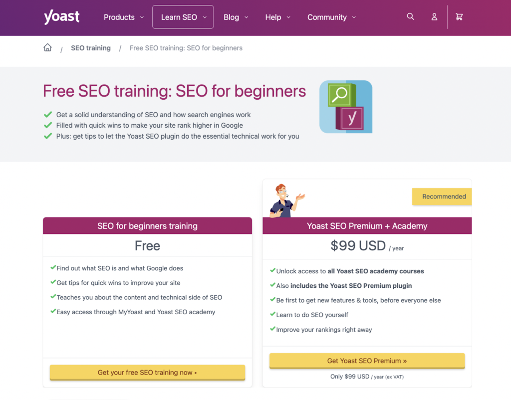 Pro tip: In Yoast SEO’s landing page, there’s also the option to pay $99 per year for Yoast SEO premium, which unlocks access to all Yoast SEO courses and the plugin, among other things. This setup is a great way to show people how your free offer compares to your paid one(s) and allow them to choose which one they want.
