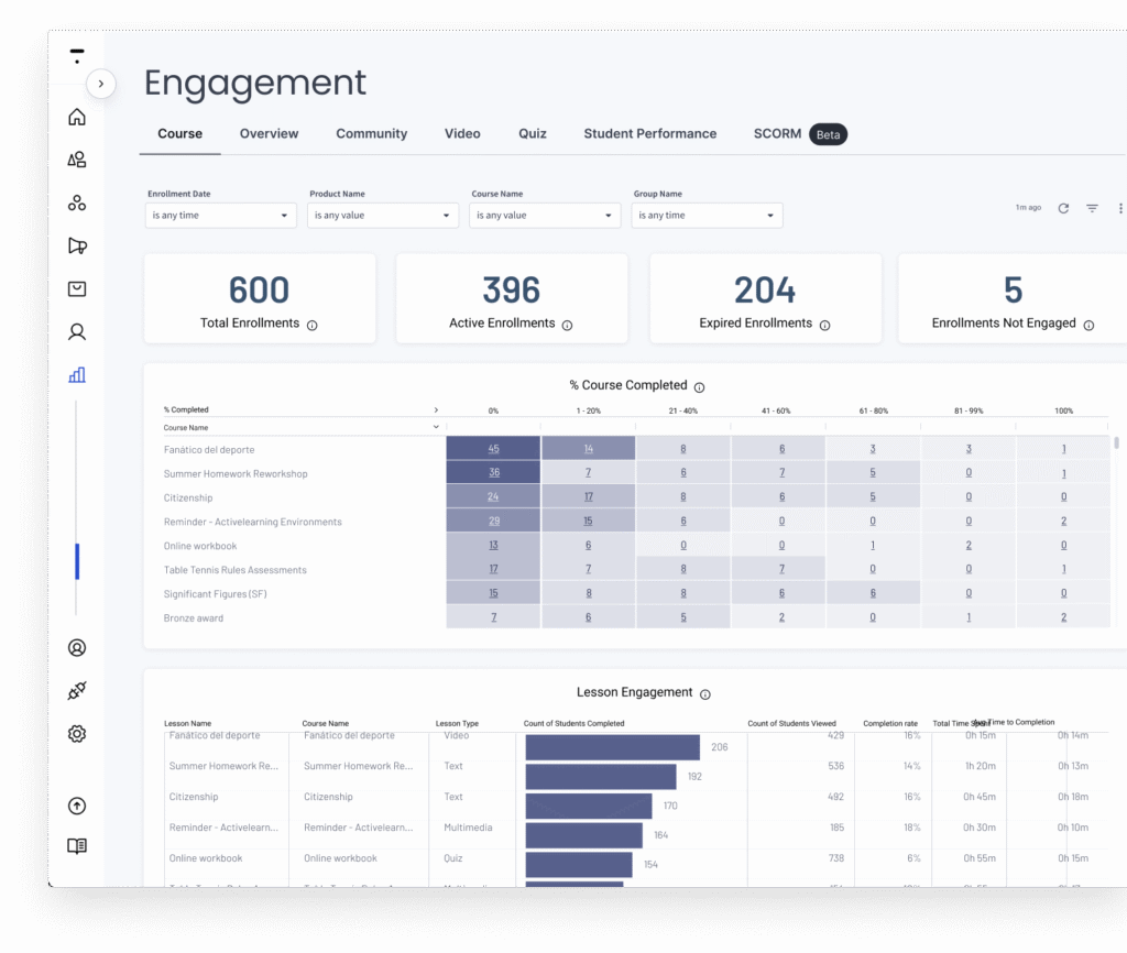 - Engagement dashboards: Track how individual learners and groups engage with your content, course completion, video views, and more.