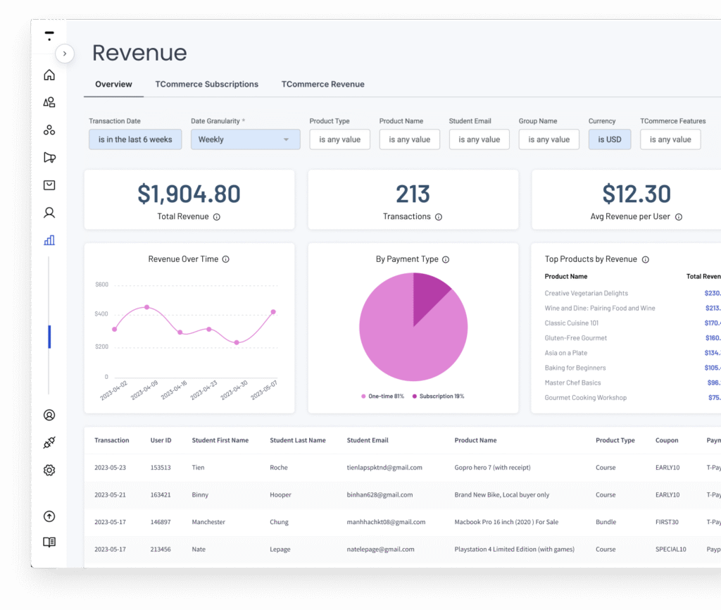 - Revenue dashboard: Track revenue over time, by product, payment type and more.