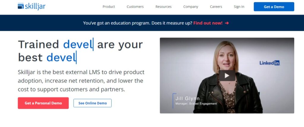 Skilljar is well-suited for large enterprises aiming to build a robust customer education academy to reduce customer churn and increase user adoption.