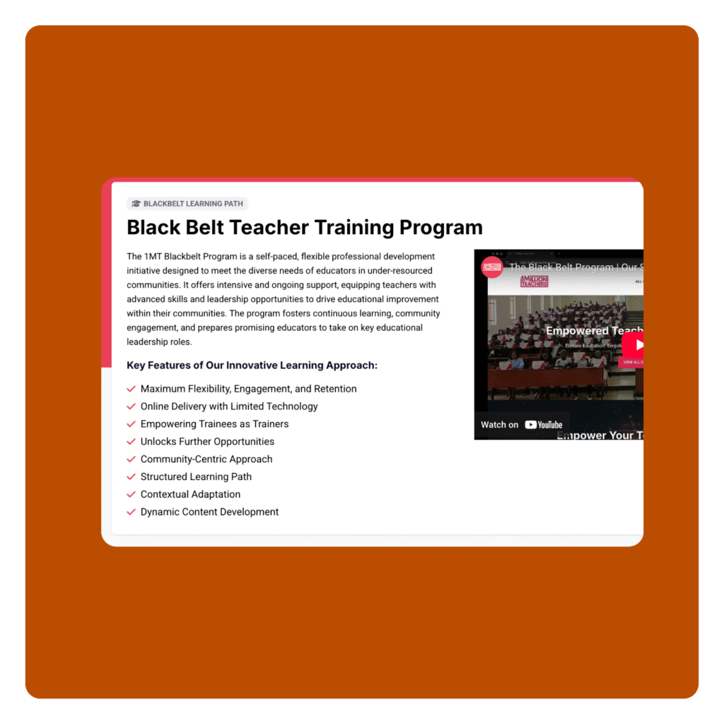 1MT needed a solution that combined flexibility with clear progression, enabling teachers to learn at their own pace while still benefiting from an organized curriculum. The organization had previously tested platforms like D2L and iSpring, but found these LMSs lacked the flexibility, longevity, and learner-first design needed to support their goals.